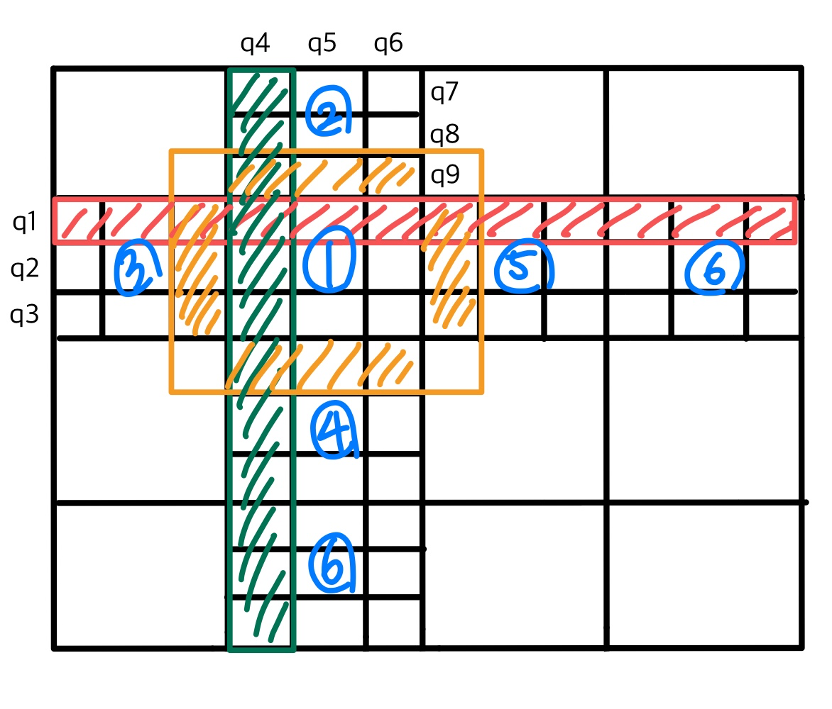 (ex. 가로 큐(q1, q2, q3)와 세로 큐(q4, q5, q6)은 서로 아랫 면과 윗 면을 공유)