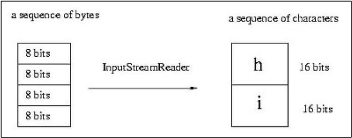 InputStreamReader와 System.in이 연결되면, 위 이미지처럼 System.in은 키보드로부터 사용자의 키를 입력 받아서 바이트 스트림을 내보내고, InputStreamReader은 바이트 스트림을 받아서 문자로 변환한 다음 응용 프로그램에게 전달합니다.