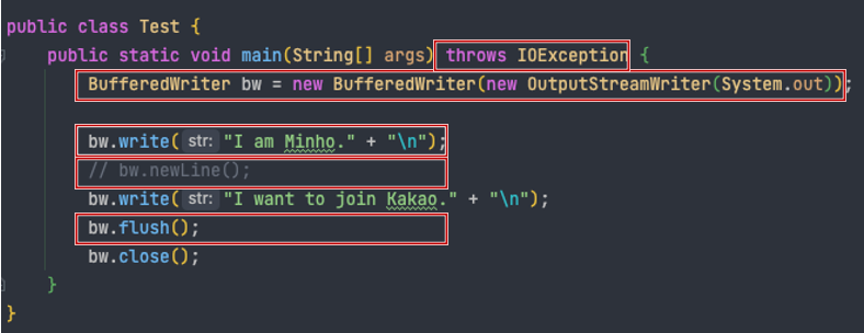 BufferedWriter를 이용하여 콘솔에 출력할 때는 마찬가지로 문자 스트림인 OutputStreamWriter와 바이트 스트림인 System.out을 연결시켜주고, IOException을 throw 해주면 됩니다.