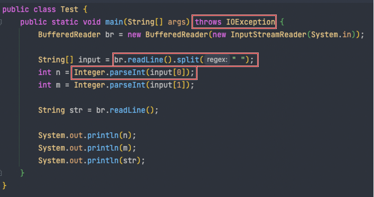 그리고 readLine()으로 라인 하나를 읽어주면 되는데요, readLine()의 내부에서 IOException이 발생할 수 있기 때문에 throw 해주면 됩니다.