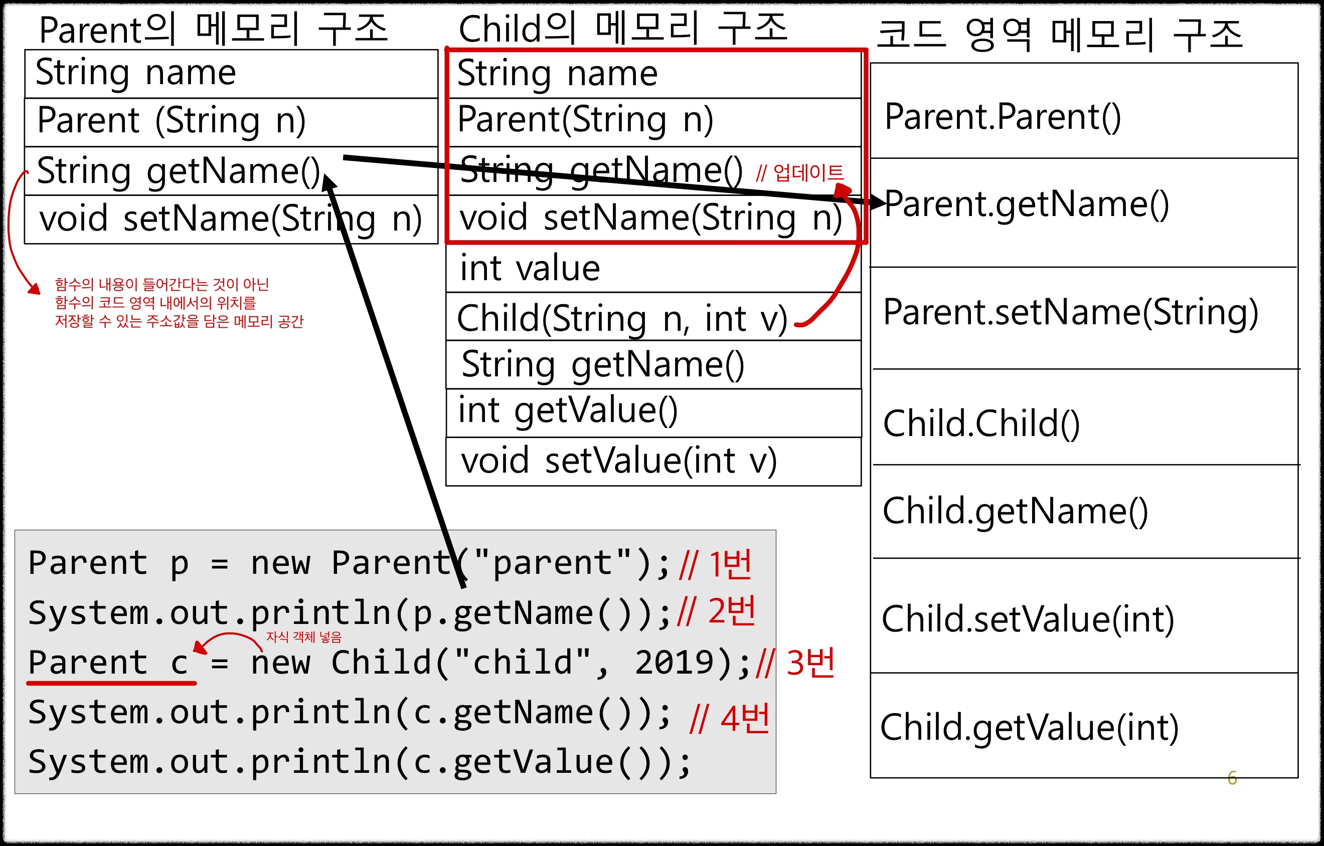 하지만, 각 객체들은 함수의 위치를 나타내는 테이블을 가지고 있으며, 부모 클래스의 메서드를 오버라이딩한 자식 객체가 부모 타입의 레퍼런스 변수에 대입될 때, 테이블에서의 부모 객체의 메서드 주소가 자식 객체의 메서드 주소로 업데이트 됩니다.