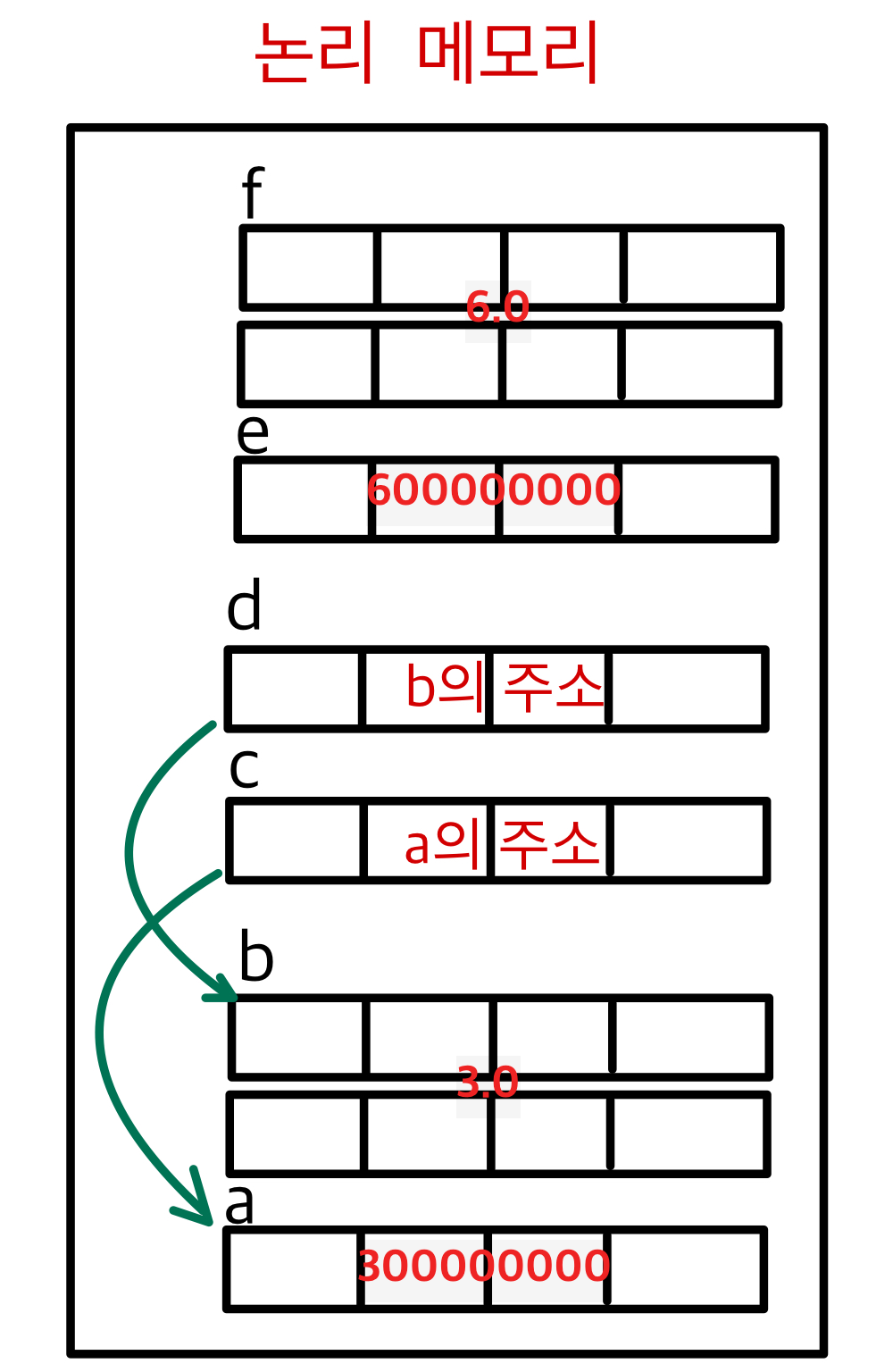 따라서 int형 변수인 a는 4개의 칸으로, double 형 변수인 b는 8개의 칸으로, 포인터 변수인 d는 4칸으로 표현하였습니다.