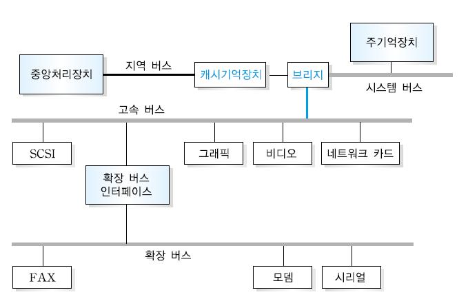 이 문제를 해결하기 위해서, 최근의 컴퓨터 시스템은 위 그림처럼 버스를 계층적으로 구성합니다.