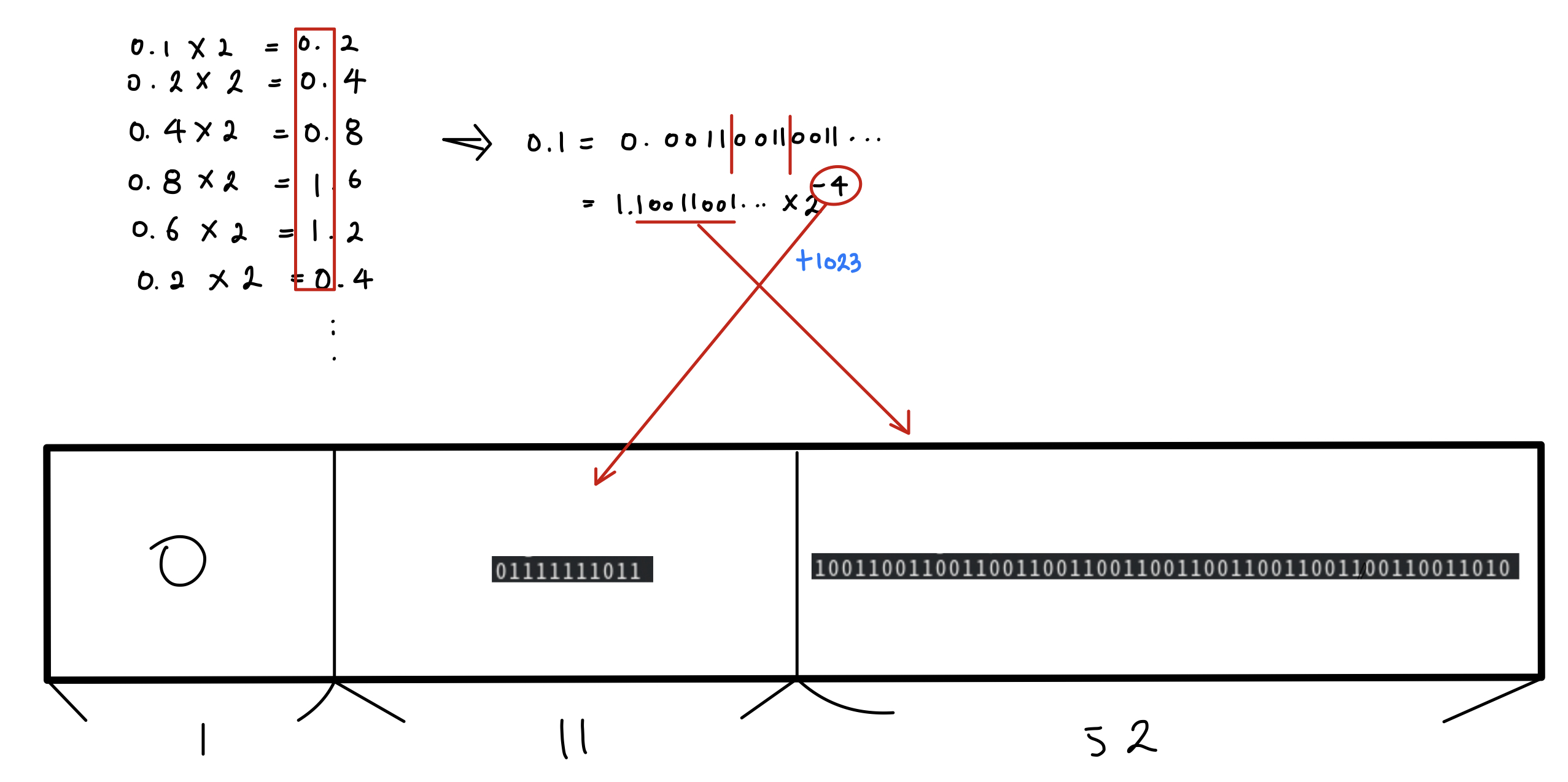 실수 0.1을 부동 소수점 표현으로 나타내면, 아래와 같습니다.