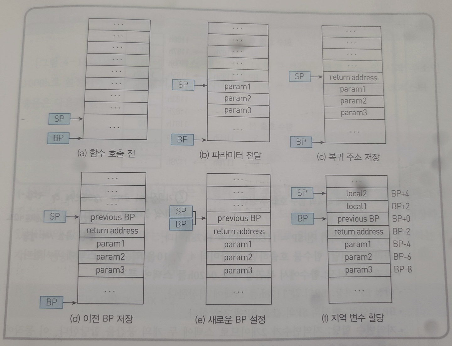 이제 베이스 포인터(BP)는 함수 callee() 스택 프레임의 기준점을 가리키게 됩니다.