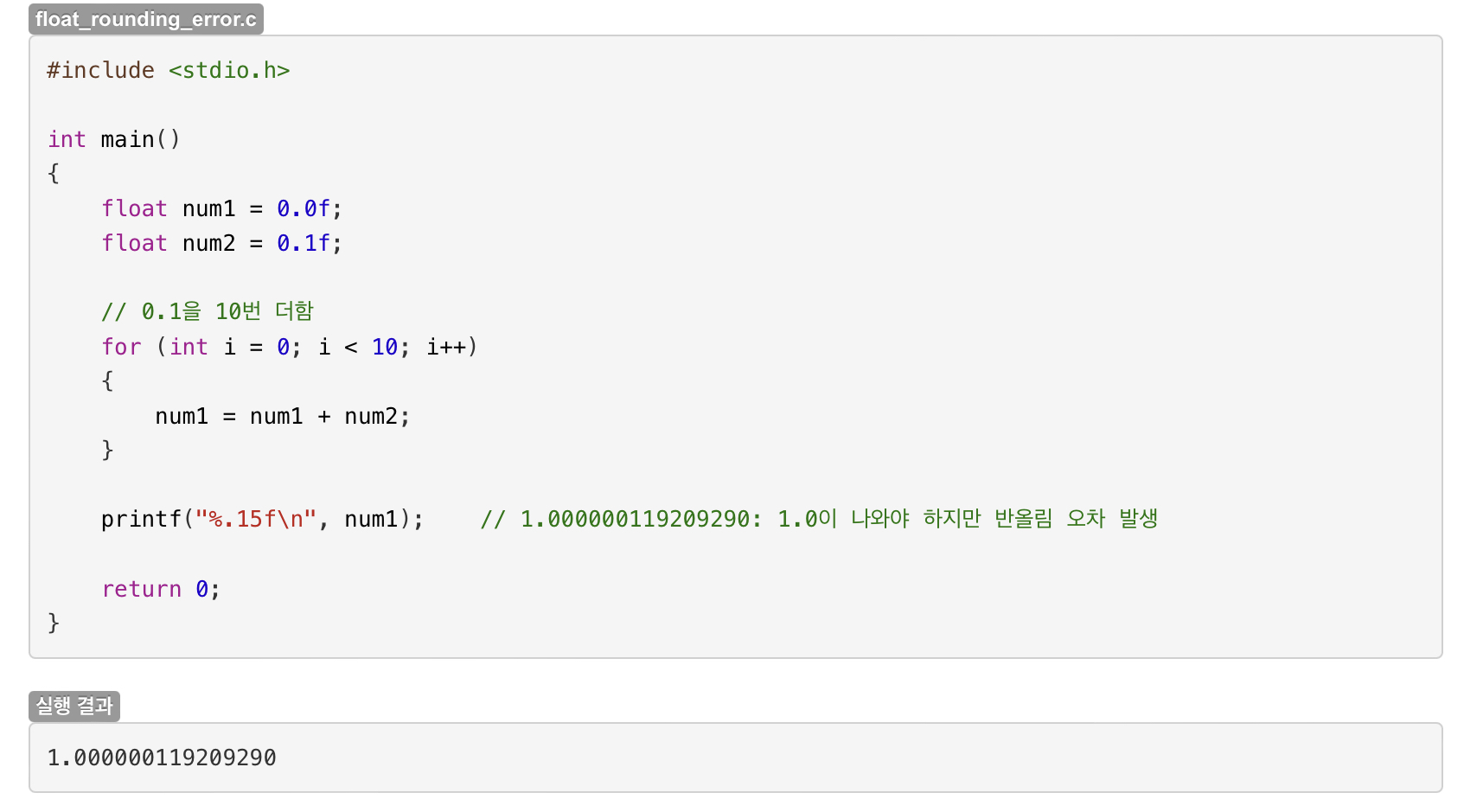 그럼 왜 0.1을 10번 더했고, 제한된 비트만 메모리에 저장했는데 왜 1보다 작은 값이 아니라 더 큰 값이 출력된 걸까요?