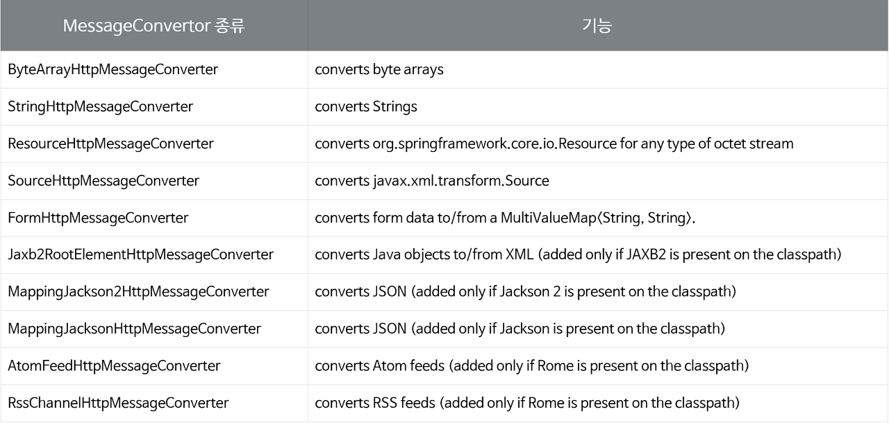 - 사용자가 임의의 메시지 컨버터(MessageConvertor)를 사용하도록 하려면 WebMvcConfigurationAdapter의 configureMessageConverters 메소드를 오버라이딩 해야한다.