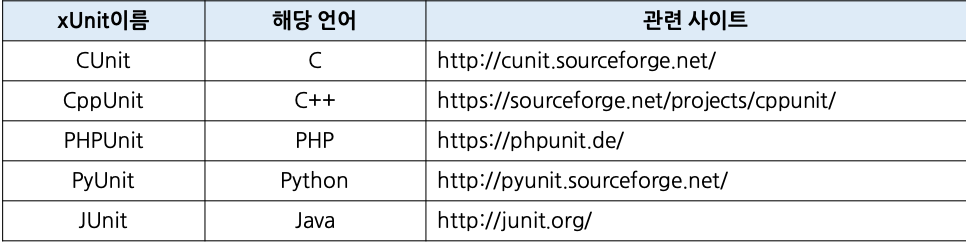 - 프로그래밍 언어마다 테스트를 위한 프레임워크가 존재한다. 이러한 도구들을 보통 xUnit이라고 하며, 자바 언어의 경우는 JUnit이라고 한다. 각 언어마다 사용되는 xUnit은 다음과 같다.