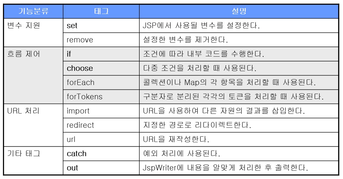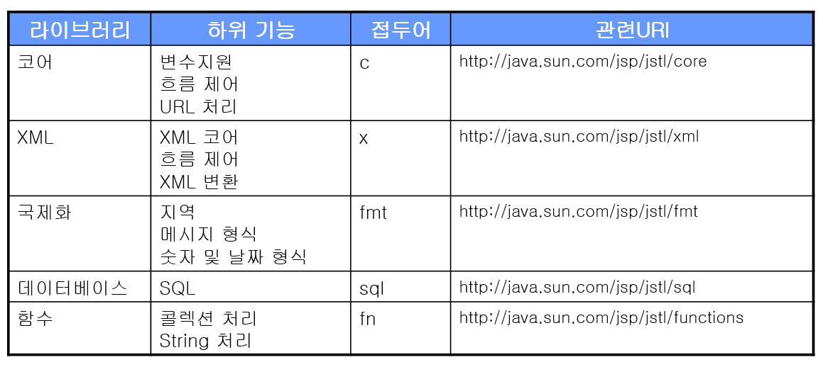 - JSTL는 JSP 페이지에서 조건문 처리, 반복문 처리 등을 html tag 형태로 작성할 수 있게 도와준다.