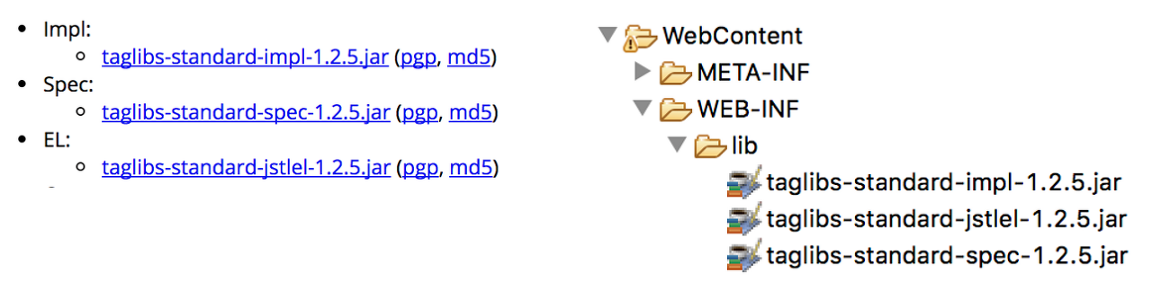 - http://tomcat.apache.org/download-taglibs.cgi에서 3가지 jar 파일을 다운로드 한 후, WEB-INF/lib/ 폴더에 복사한다.